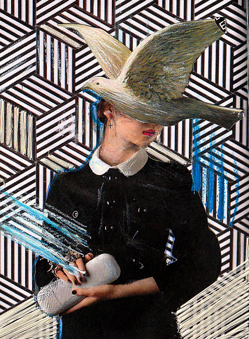 « Dove me (Hommage à Magritte)", 2018, 30 x 20 cm, Collage, mixed media, sewing thread on paper